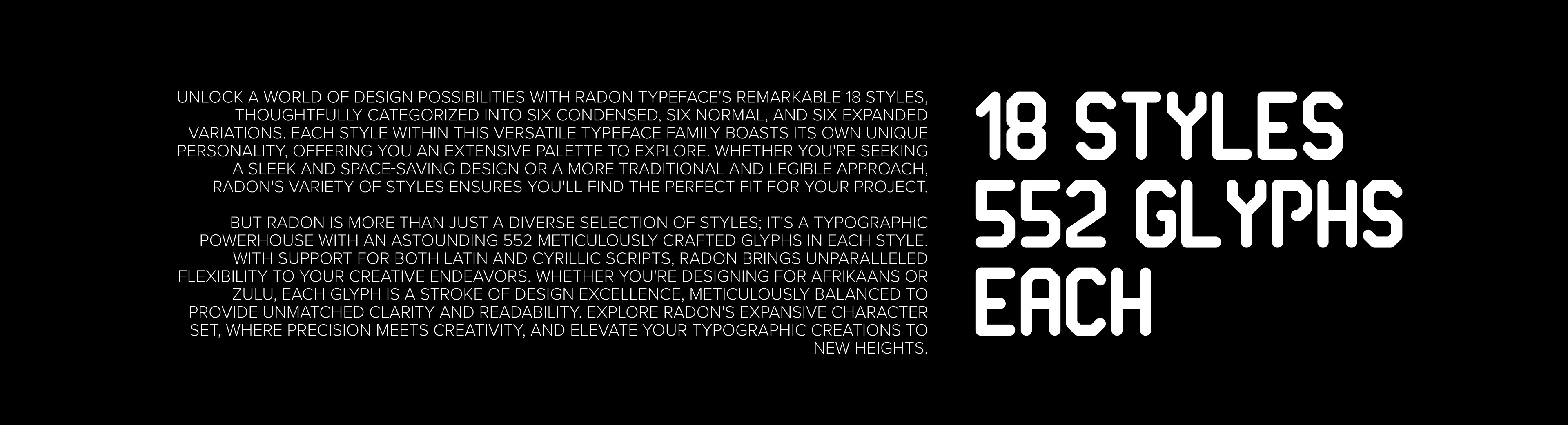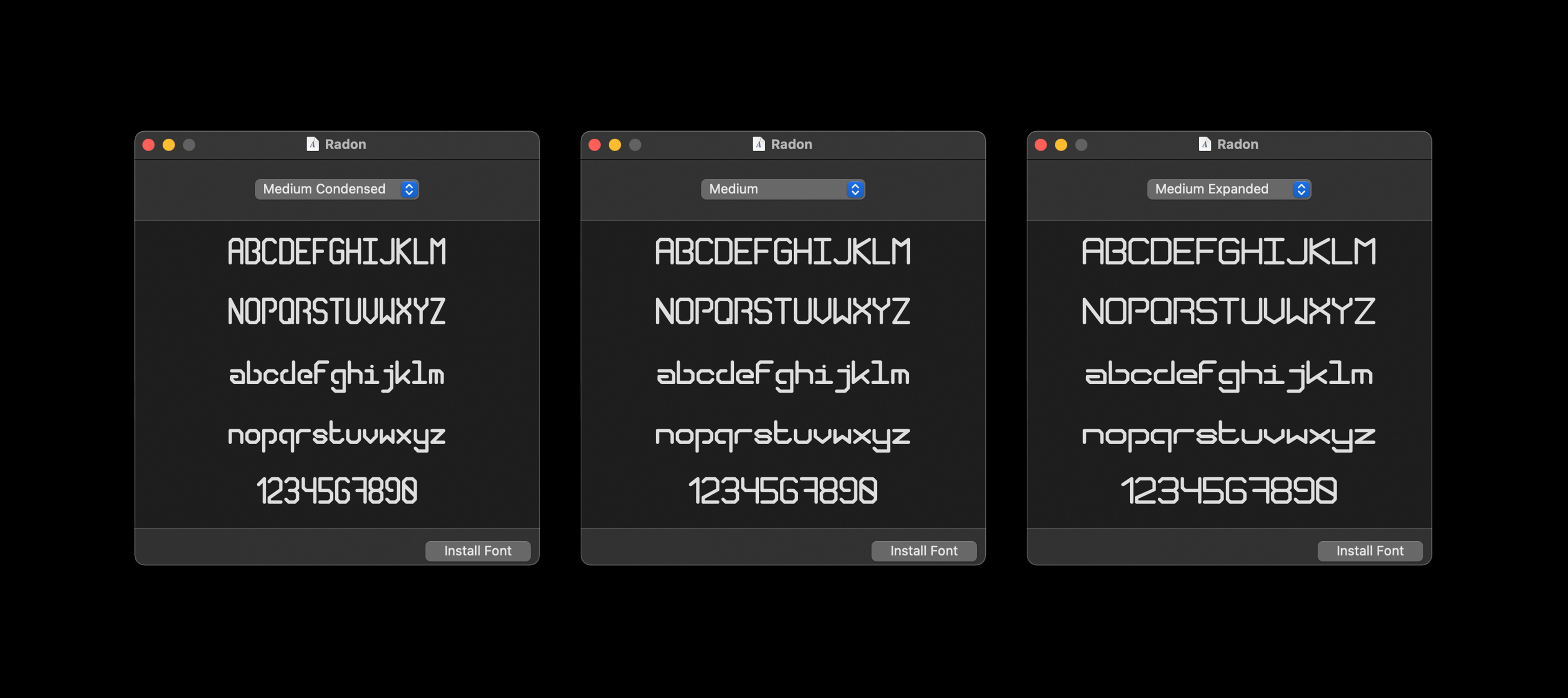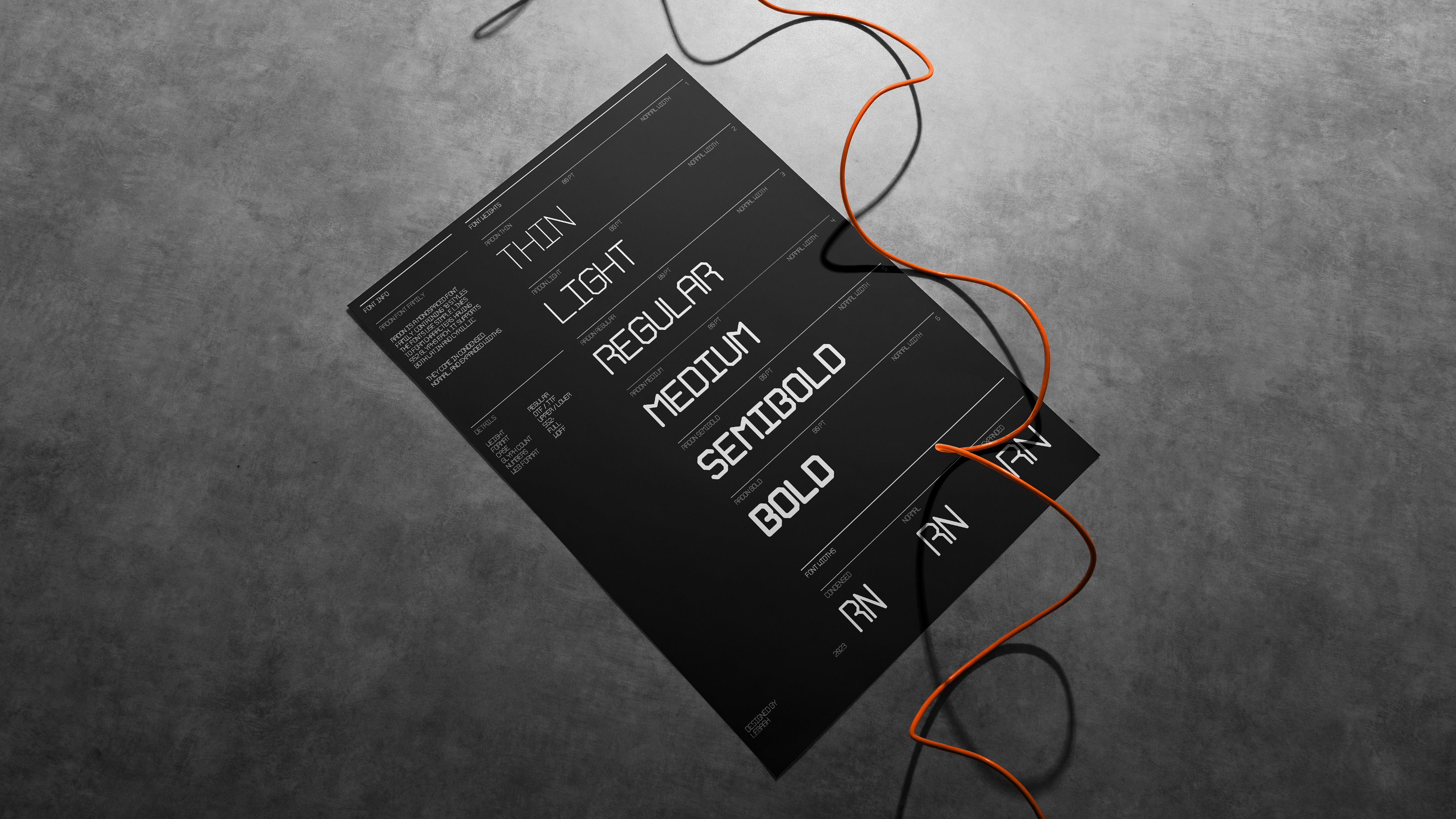is a monospaced font family, containing 18 styles. The fonts use simple lines to form characters. Having 552 glyphs each, it supports both Latin and Cyrillic. They come in condensed, normal, and expanded widths.